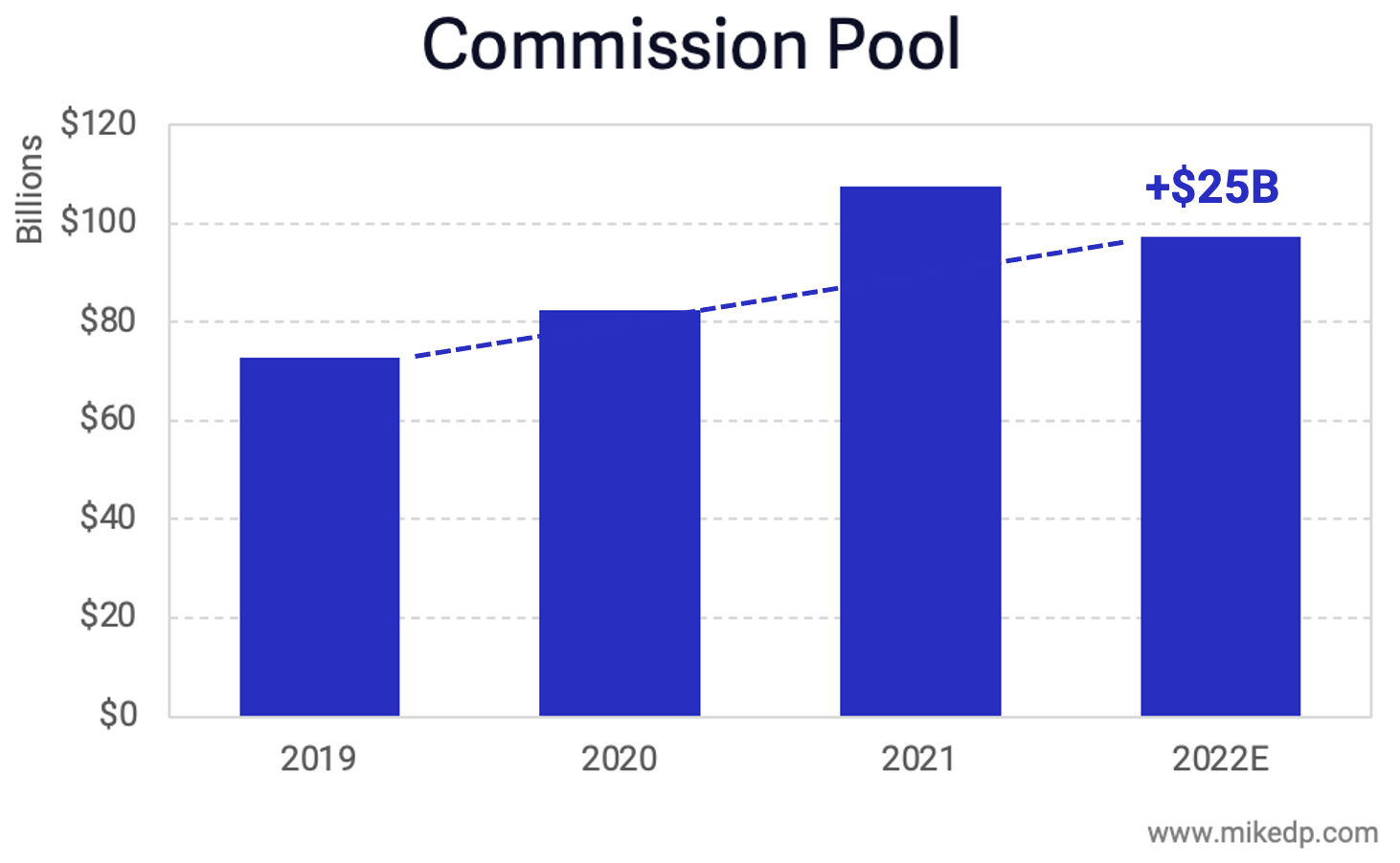 The big picture: Despite dropping volumes, the commission pool -- which fuels the revenue of real estate agents, brokerages, portals, software providers, and more -- is set to be 34 percent, or $25 billion, higher than 2019.