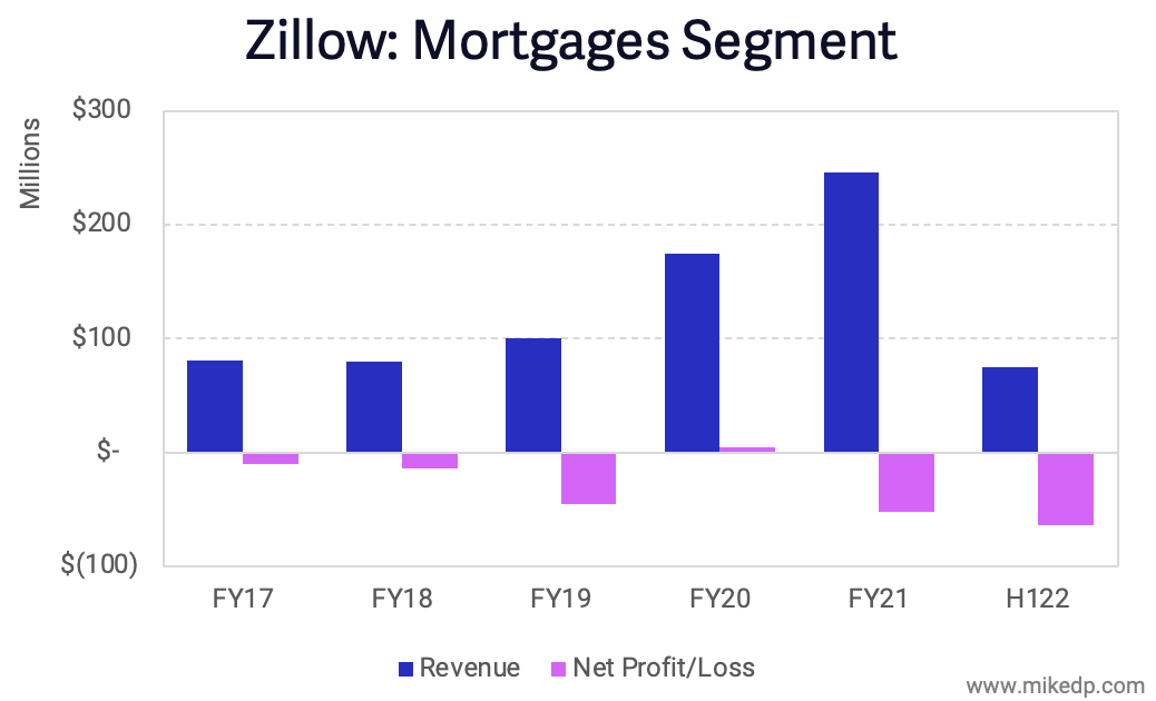 Zillow's mortgage business has been unprofitable for over five years, recently spending $1.85 for every $1 in mortgage revenue.