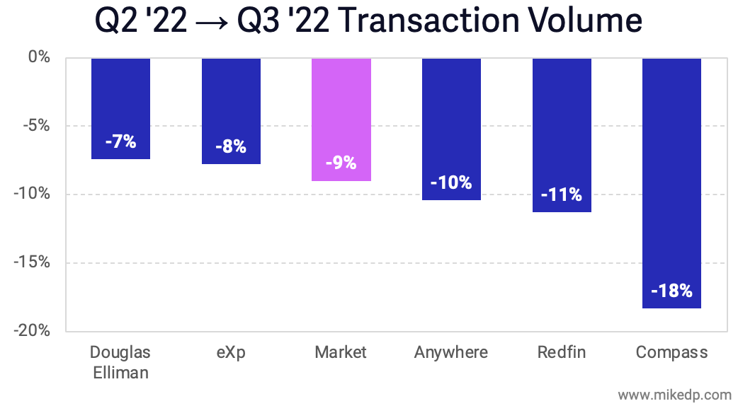 Douglas Elliman and Compass experienced the largest decline, a likely combination of concentration in more upscale markets (NYC and California) that are cooling faster than others.