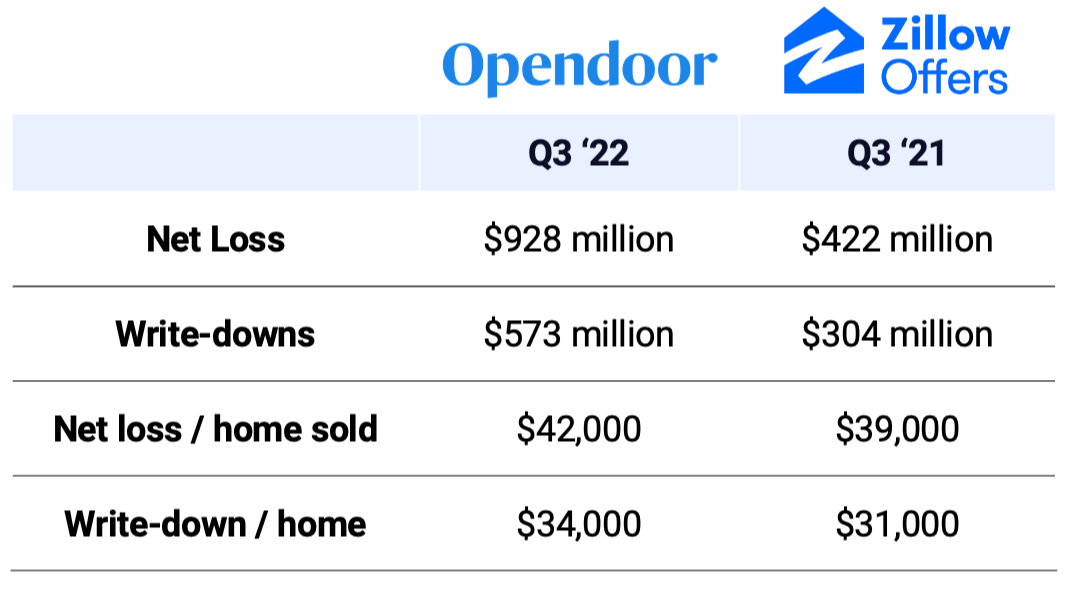 Dig deeper: Opendoor’s net loss of $928 million for the quarter is more than double Zillow Offer’s net loss of $422 million in Q3 of last year.