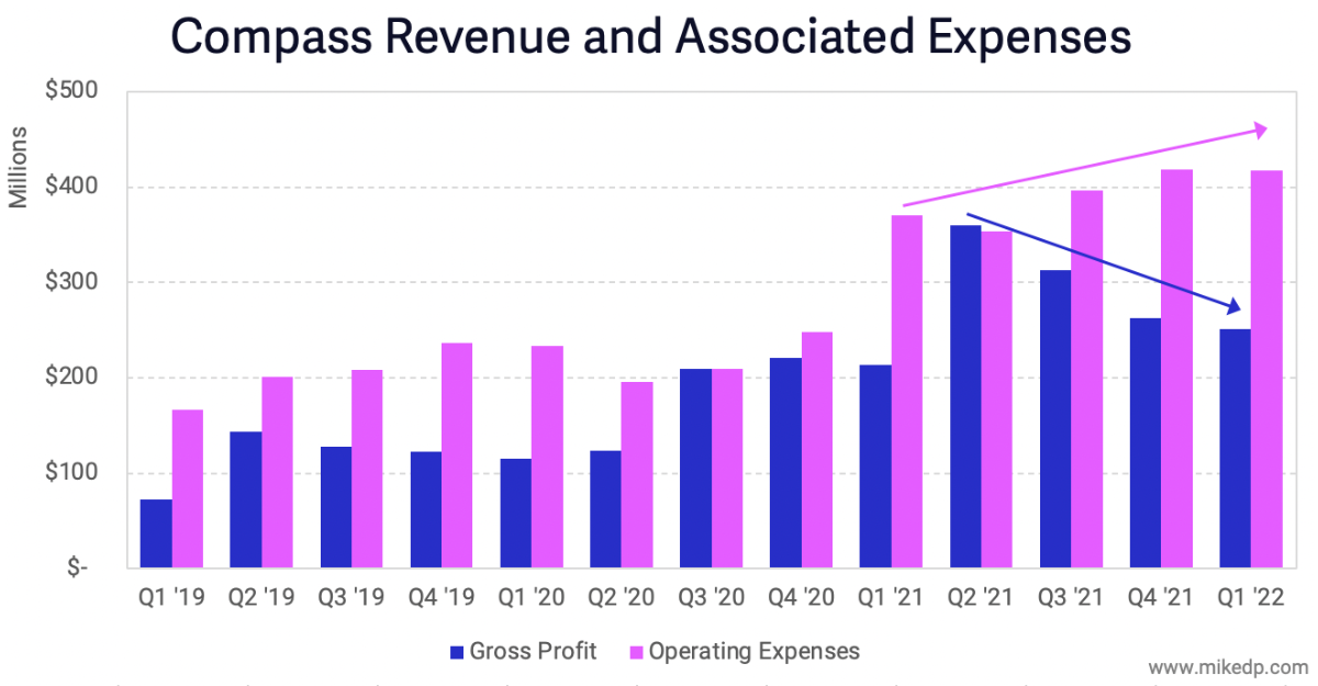 Compass' cost base is significantly higher than last year; operating expenses are up 50 percent from Q1 2021 (excluding stock-based compensation).