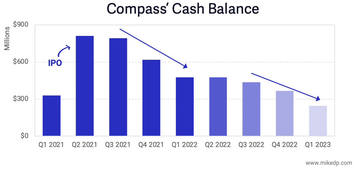 Compass' latest financial results reveal a company that burned $142 million in cash during the first three months of 2022, with $476 million left in the bank.