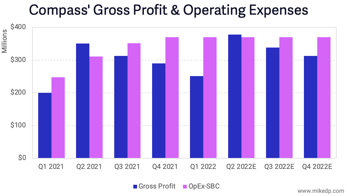 There's a widening gap between Compass' gross profit (revenues after commission expense) and its operating expenses.