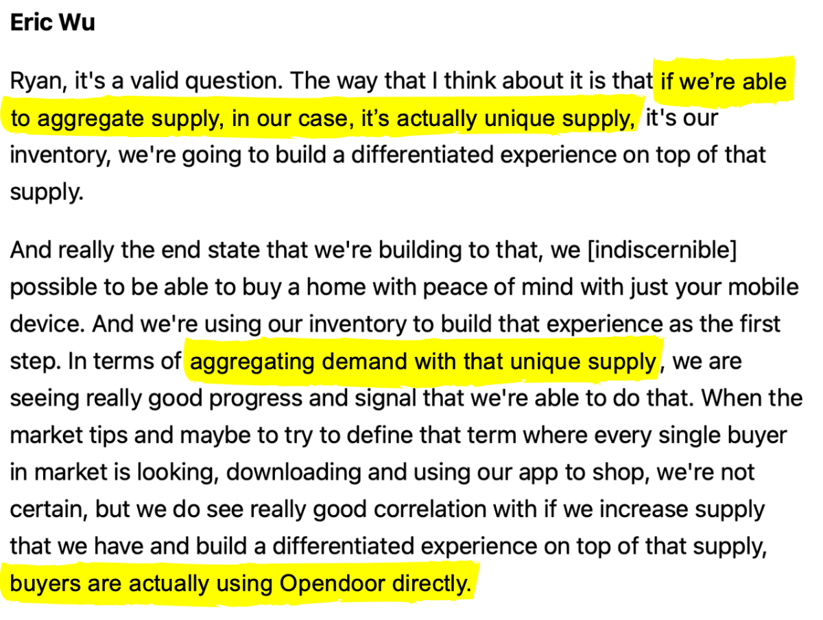 Tucked away in Opendoor's recent earnings call was an enlightening statement by its CEO, Eric Wu, which sheds light on its exclusive supply strategy.