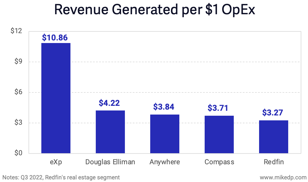 Based on this metric, eXp was about three times more efficient in Q3 2022 than its publicly-listed brokerage peers (who are all in the $3–4 range).