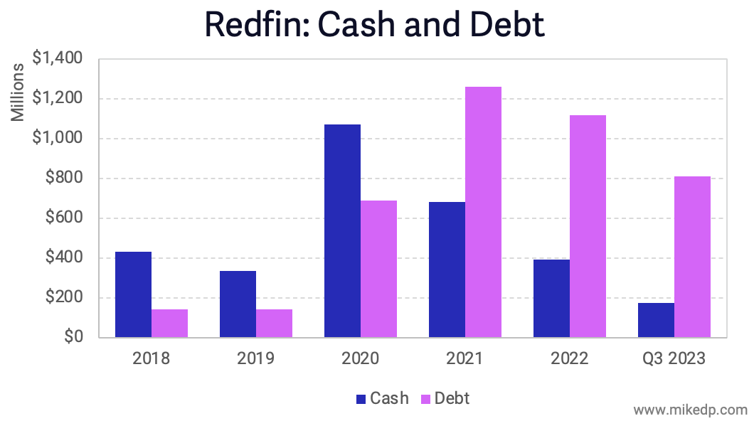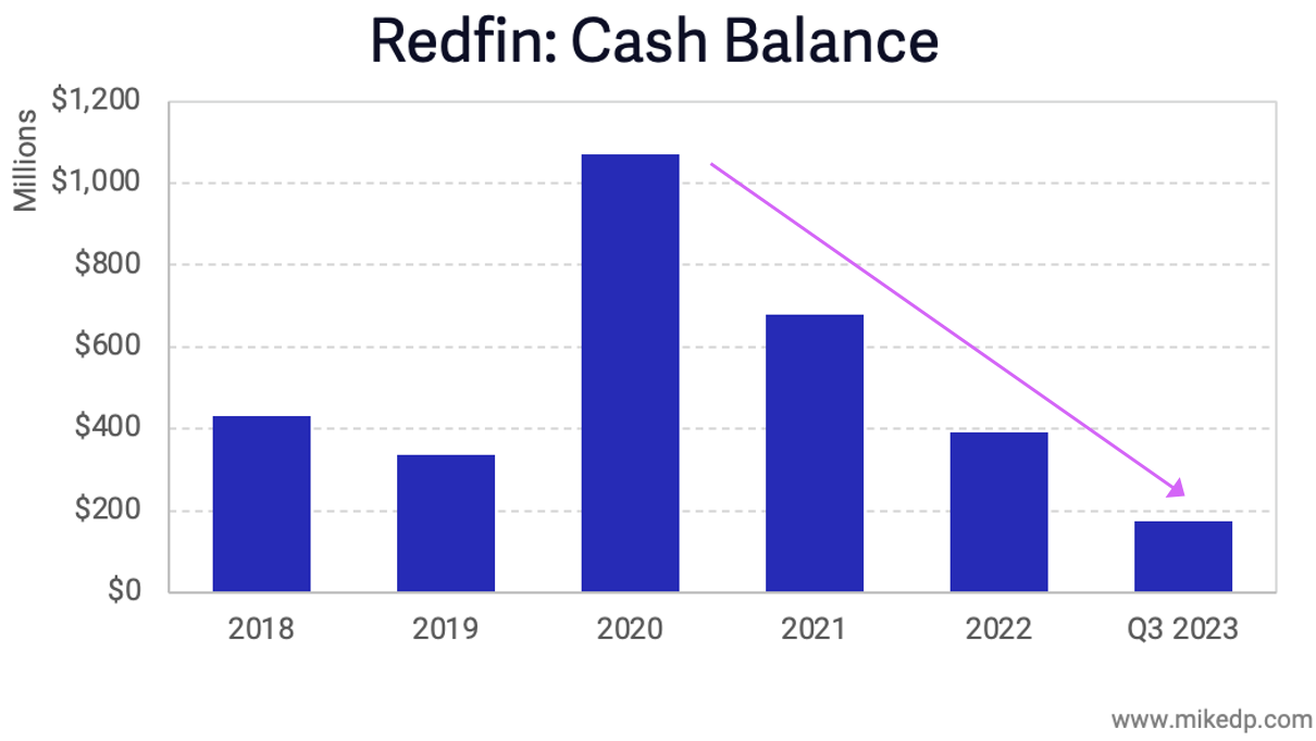 Since 2020, Redfin’s available cash balance (cash and liquid investments) declined sharply, from over $1 billion in 2020 to just $173 million at the end of Q3 2023.