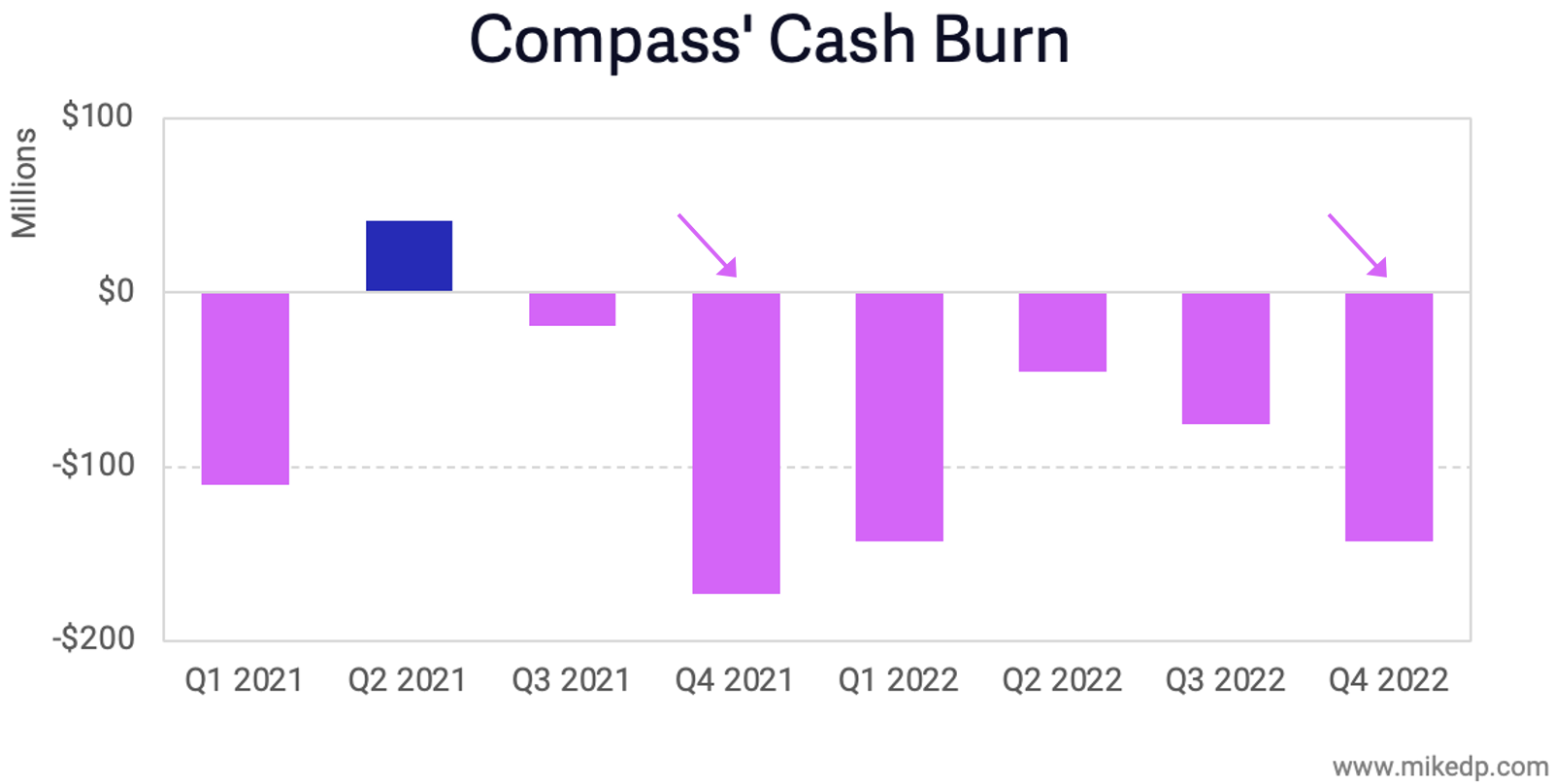 Even in a much softer market, Compass’ Q4 2022 cash burn is less than a year ago, a reflection of the cuts already made to the business.