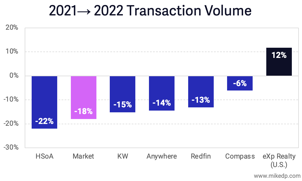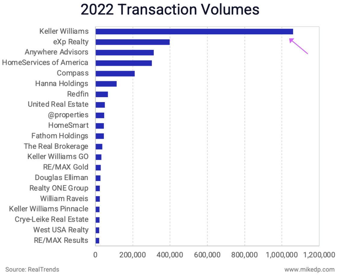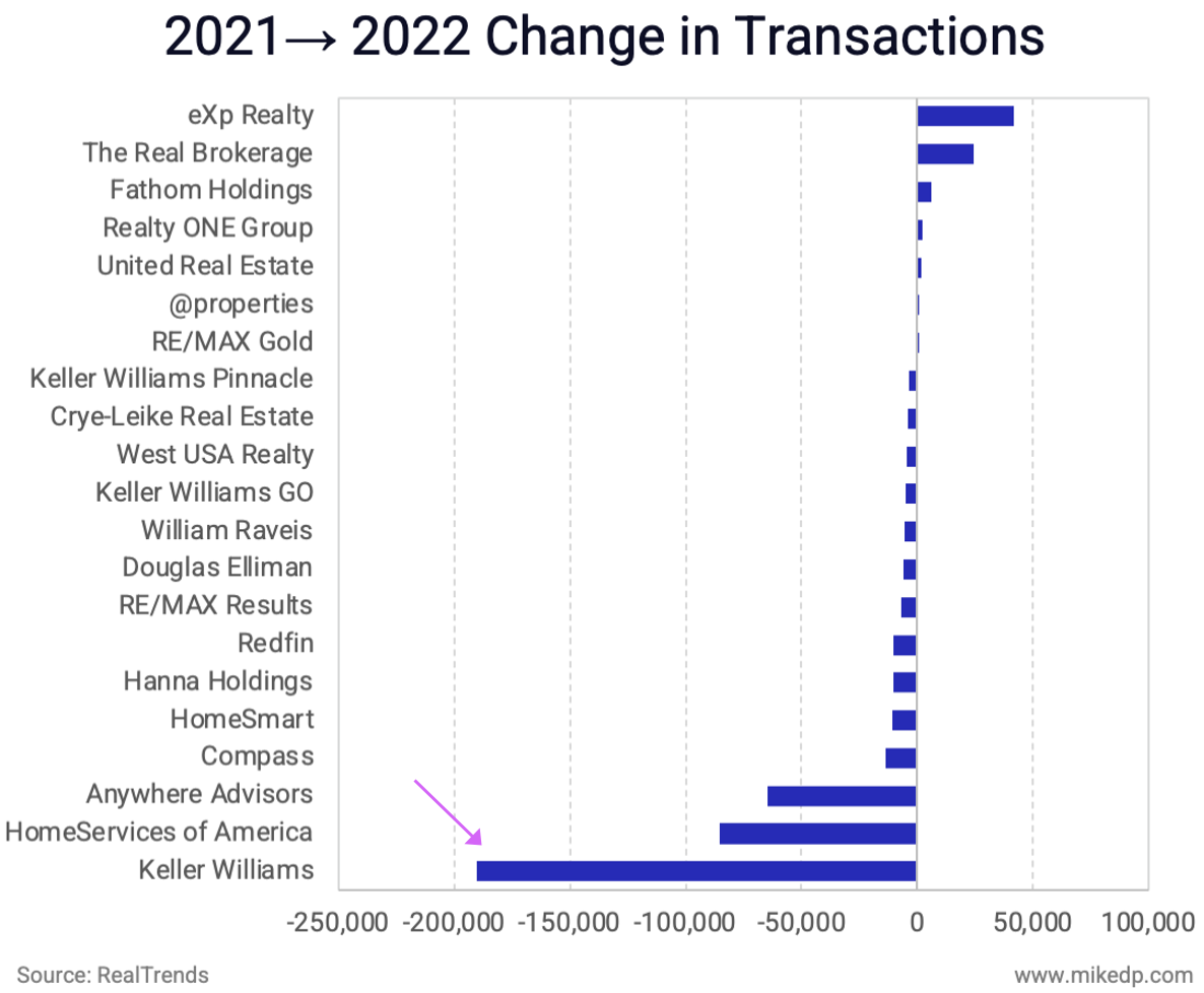 When Keller Williams is added to the list, we see that it lost 190,000 transactions in 2022 compared to 2021 – more than Anywhere, HomeServices of America, and Compass combined.