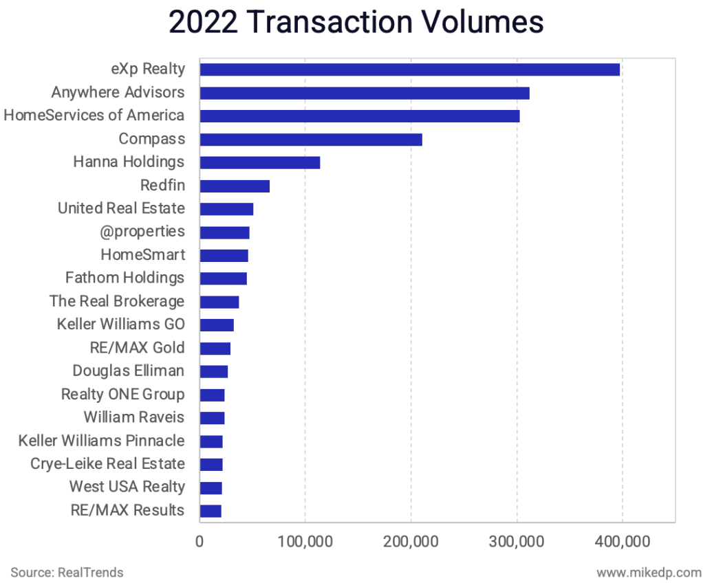 Context: According to the latest data from RealTrends, the top 20 brokerages by transaction count in 2022 (and the sample set for this analysis) were led by eXp Realty, Anywhere, HomeServices of America, Compass, and Howard Hanna.