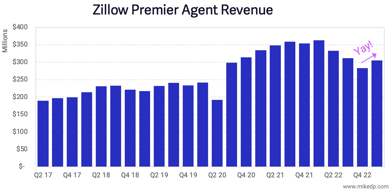 Premier Agent revenue was up 8 percent from Q4 2022 (but still down 16 percent from the heady days of early 2022, when the market was at its peak).