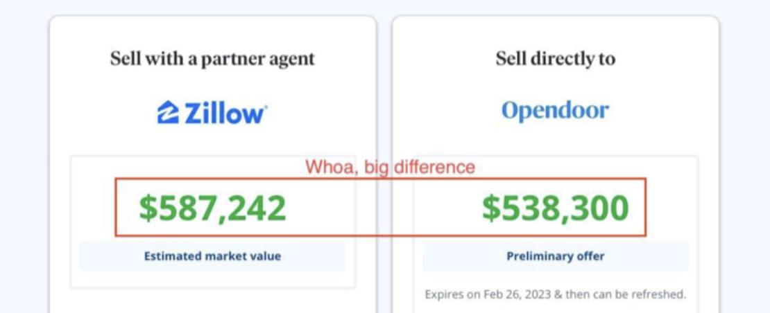 For example, in the Zillow + Opendoor seller options marketplace, Opendoor’s cash offer is usually considerably lower than Zillow’s estimated market value.
