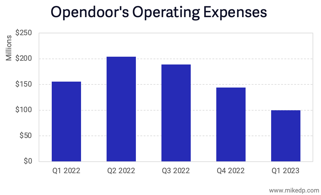 The net result is clarity around Opendoor’s recent cost-cutting: fixed operating expenses are down $100 million, or 50 percent, from Q2 2022, driven through a reduction in advertising spend, layoffs, and other cost-cutting measures.