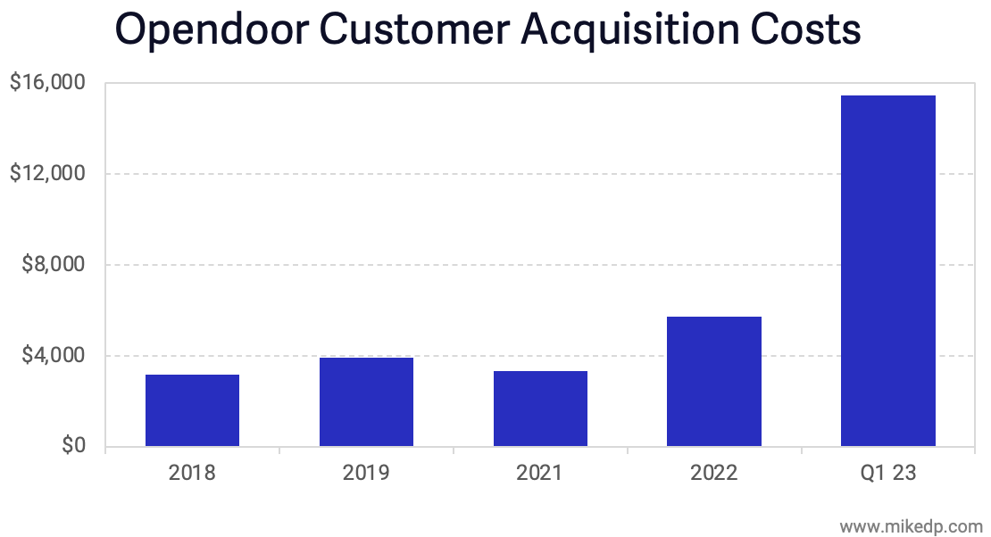 Compared to 2022, Opendoor’s CAC has tripled to $16k during the first quarter of 2023 – a very unsustainable number in the long term, but one reflective of sustained brand marketing coupled with markedly fewer purchases.