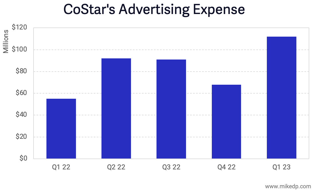 Homes.com’s Q1 growth of 7 million monthly uniques did not come cheap; CoStar spent $112 million across all of its consumer properties during the quarter, including an increase of $55 million “primarily for SEM advertising of our residential brands.”