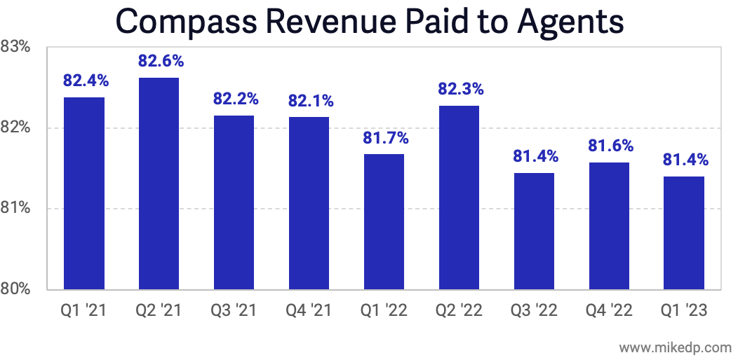 Compass is paying its agents less over time, through a combination of reducing existing agent splits, recruiting new agents with lower splits, and higher fees.