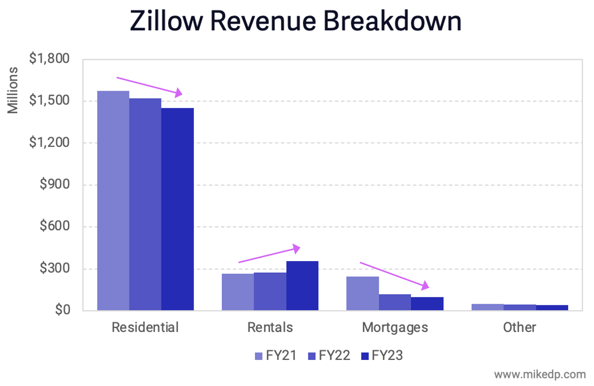 Over a challenging two years, Zillow’s residential and mortgage businesses have shrunk (on par with the declining market), while its rentals business has ticked up from strong organic growth.