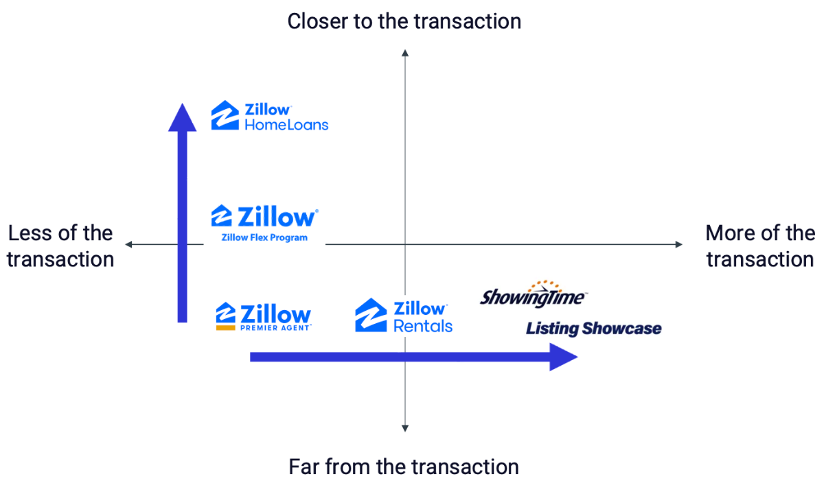 Zillow’s evolving strategy sees it getting closer to the real estate transaction (Zillow Flex and Zillow Home Loans) and expanding to more parts of the transaction (Mortgages, Rentals, Seller Services, Agent Tools).