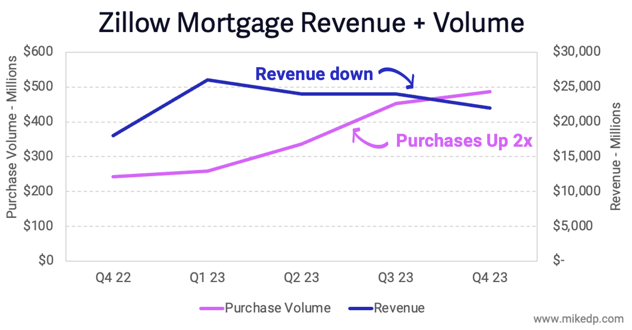 Zillow’s mortgage business is growing, but, counter-intuitively, revenue is dropping as purchase volume nearly doubles.