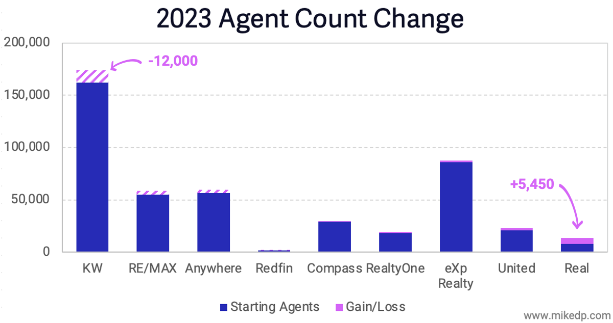 During 2023, agents continued to stream out of the big legacy brands for the lure of low-fee brokerage models, where agents can keep more of their commission.