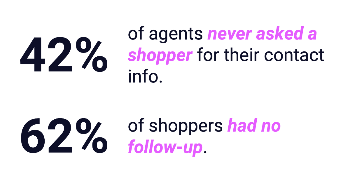 Of the 58 percent of agents that did ask for contact information, a third of the time the agent never followed up with a phone call, email, or text message.