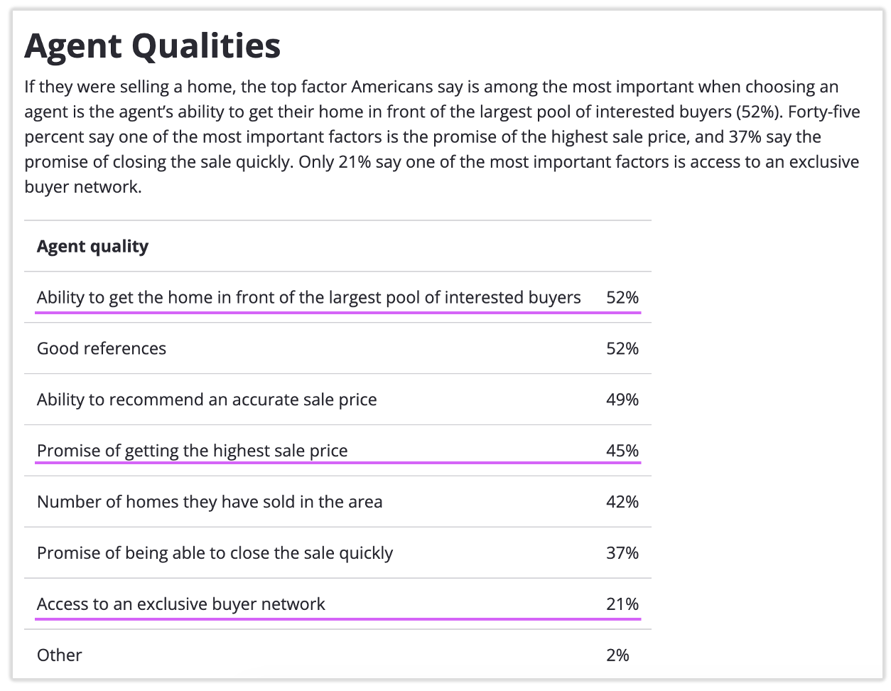 For instance: 52 percent of respondents said one of the most important factors when choosing an agent is that agent’s ability to get their home in front of the largest pool of interested buyers – meaning that broad exposure was not among the most important factors for 48 percent of people.