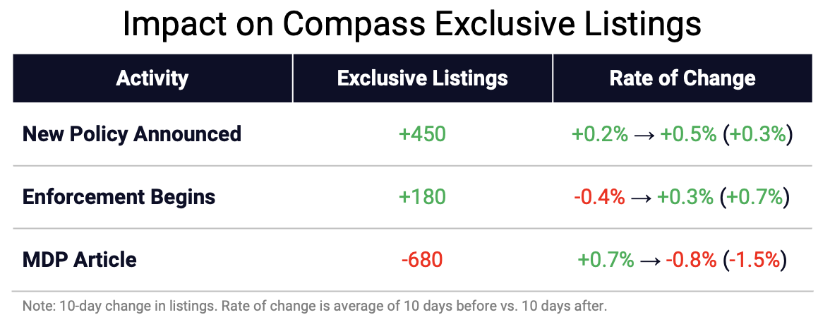 The most obvious benefit of exclusive inventory is driving homebuyers to Compass agents for access to inventory they can’t find anywhere else.