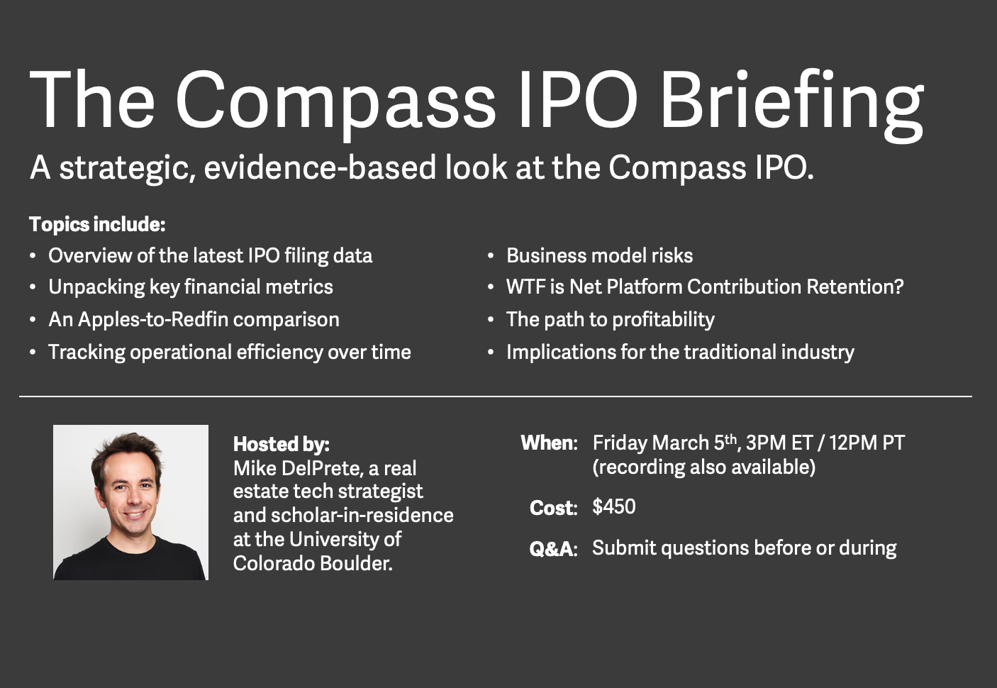 On Friday, March 5th, I'll be hosting the Compass IPO Briefing: a strategic, evidence-based look at the Compass IPO. This 45ish-minute webinar includes plenty of charts, analysis, and the latest data from its IPO filings — in addition to Q&A.